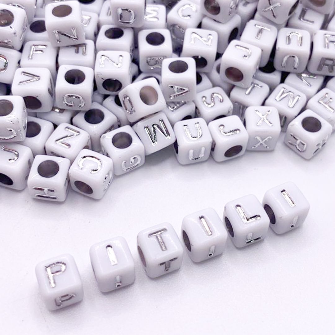 Miçanga infantil branca com letra prata de 6mm com 100g, ideal para a confecção de itens de artesanato como colares, pulseiras, terços, tornozeleira e artesanatos em geral.